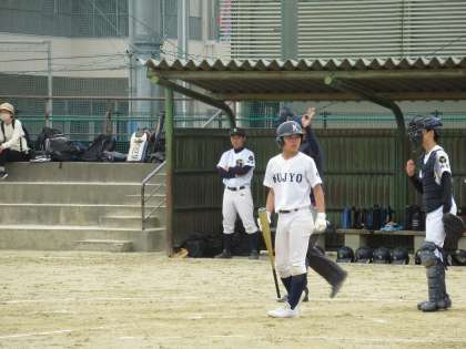 4回表の相手の攻撃をピシャリと抑え、その裏の攻撃へ。ここで九条中が1点をとれば、4回10点差のコールド勝ちとなります。