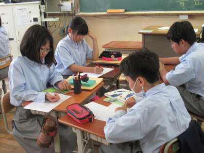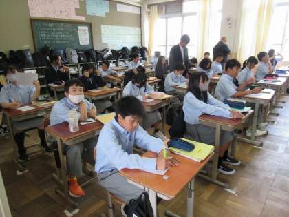 2組は数学の授業で「正の数・負の数の計算問題」の学習です。最初の個人学習の場面では、し〜んと静かな雰囲気の中、すごい集中力で取り組んでいましたね。素晴らしい!問題の中には、高校受験の問題も含まれていて、果敢に挑戦していきます。そこで、わからなかった問題は、グループで意見交流や教え合いをして解決していきました。その調子で続けてください。