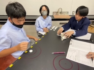 1組物理の授業では、実際にモノを転がせてデータを取っているようです。協力してできていますね。