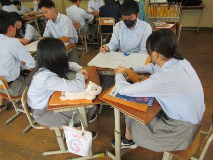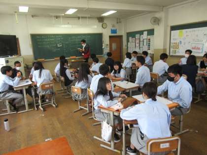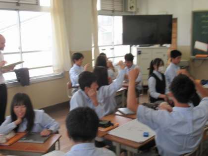 こういう授業は英語が身近にある感じがしていいですね。先生が英語で出題されるときは「し〜ん」と集中して聞き、正解が英語で告げられるとガッツポーズとともに一気に盛り上がって、コミュニケーションが生かされています。