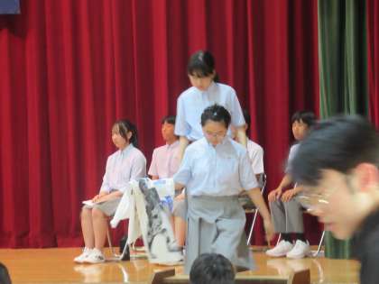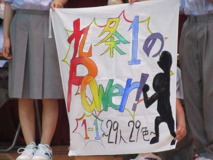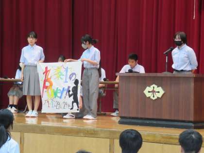 今度は「学級旗」のお披露目です。各クラス、学級目標や学級旗にたくした思いを発表しながら、自慢の学級旗を紹介してくれました。