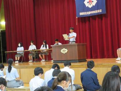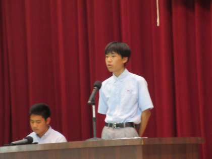 また、生徒会本部役員庶務のYさんからは、「アルミ缶・エコキャップ・使い捨てコンタクトレンズケース回収運動」についての説明と、「生徒会予算」について発表してくれました。