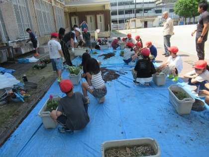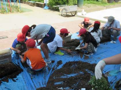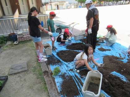 1つのプランターを2人で担当して作業していきます。土をふるいに入れる人、それを振っていらないものを取り除く人というように、作業を分担して進めていきます。皆さん、上手です。