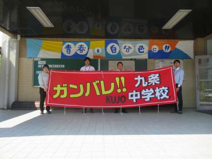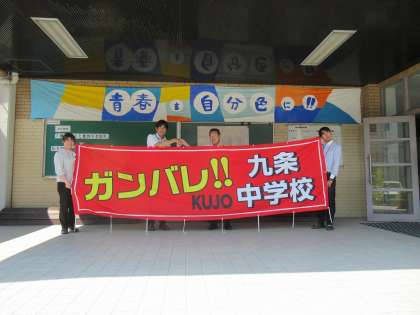 「ガンバレ!! KUJO 九条中学校」この横断幕に見守られ、部活の大会や学校行事で躍動する九条中生の姿が目に浮かびます。期待に応えようぜ!京都一の九条中生たち!!