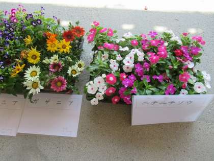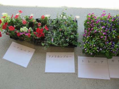 今回、用意していただいたお花は、日日草(にちにちそう)、ガザニア、トレニア、アメリカンブルー、ペチュニアの5種類です。どれをとってもきれいで、選ぶのに迷います。