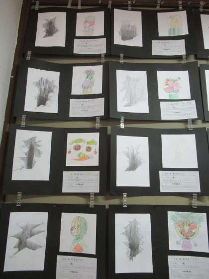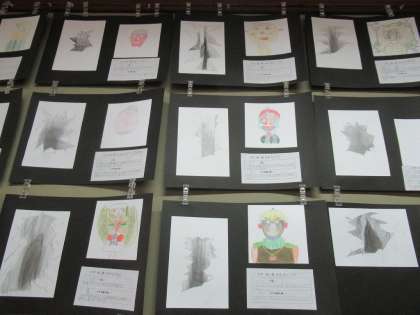 「崖(がけ)」は下方向から覗くように見ると本当に迫力があります。また「不思議な顔」は、ユニークでカラフルに描かれ、個性が光ります。2年生、やるねぇ!