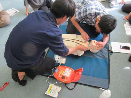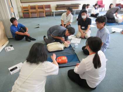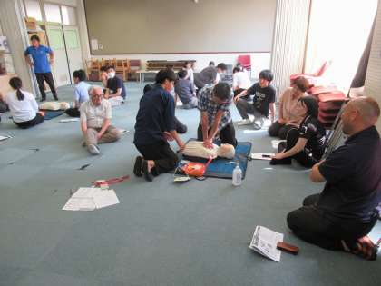 この研修は毎年行っていますが、今回は今年本校に赴任されたI先生が普通救命のライセンスをお持ちということで、わかりやすく実技も含めて進めていただきました。