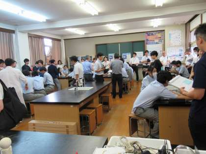 「衝突実験器」と名付けられた器具を使い、3種類の重さの球をいろいろな速さで木片にぶつけたときのデータを記録していきます。何と、60回分のデータを取りました。各グループともに、協力してがんばったねぇ。