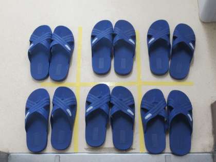 1年、2年のフロアでは、トイレのスリッパがそろえやすいように工夫がされています。まるで発着を待つ「プラットホーム」のように区切られたラインがいいねぇ。おかげで今日もそろってるね!