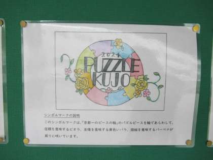 このシンボルマークは、本年度の生徒会スローガン「パズル〜京都一のピースの輪〜」から、パズルピースを輪で表して、信頼を意味するビオラ、友情を意味する黄色いバラ、団結を意味するバーベナが周りに咲いているデザインです。