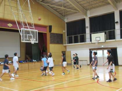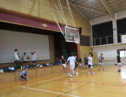 男子バスケットボール部も、実践を意識した練習を行っていました。夏季大会について話を伺うと、3年生Wさんは「1回戦を突破すると、春季大会2位のチームと当たるかもしれないので、絶対頑張ります。」と話してくれました。気合い十分で、いいね!コンディションを整えて、頑張ってください!