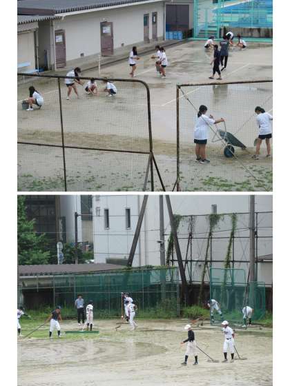 午後のグラウンドでは、ソフトテニス部と野球部の皆さんが、部活動に向けてグラウンド整備を行っていました。