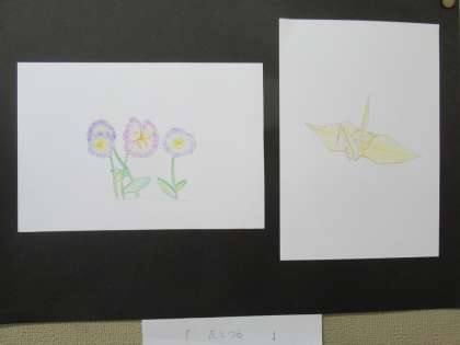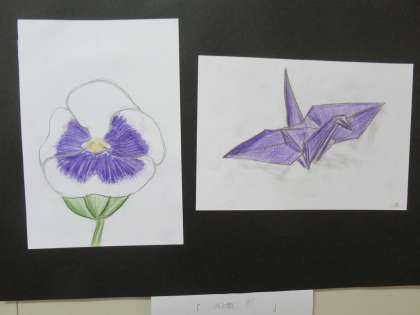 現在、美術室前の壁面には、1年生が美術の授業で取り組んだ「花」と「折り鶴」の作品が展示されています。これは「見つめ、感じ取り、描く」をテーマとした作品で、どれもとってもステキです。