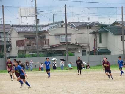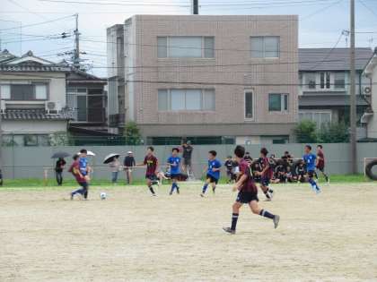 すると、その取り返したボールをフォワード陣がつなぎ両サイドからゴールを狙っていきます。徐々に相手ゴールに迫っていく九条中の連続攻撃、相手ゴールキーパーと絡む場面も増えていきます。後半開始から完全に九条中のサッカーで進む展開に移ってきました。早く得点が欲しい!