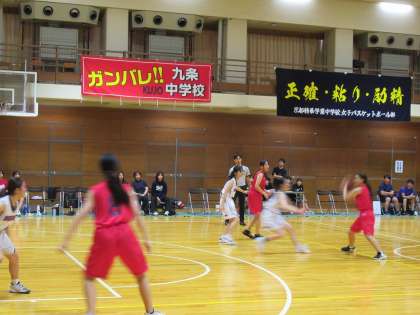 6−6の同点となり、九条中、最初のタイムアウト。一息入れます。その効果あって、タイムアウト後の一本目で、Tさんがバスケットカウントをものにし、9−6、再びリードします。よっしゃー!