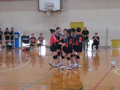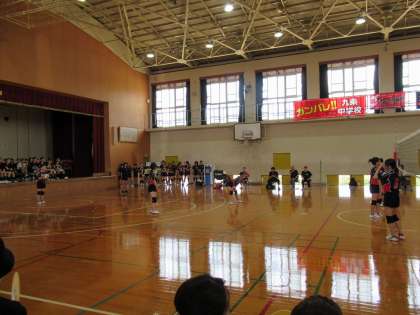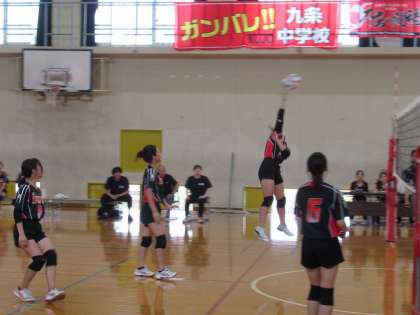 横断幕「ガンバレ!! KUJO 九条中学校」に見守られ、立ち上がりから気合いの入ったプレーで臨んでいく中、Fさんのツーアタックが見事に決まり、一気に盛り上がります。