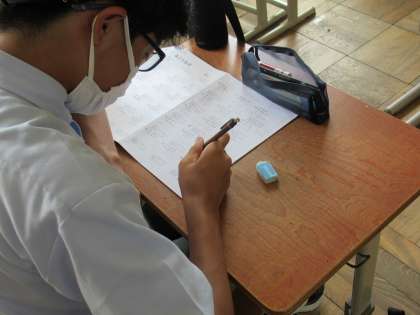 「では、Nさん特集でいきますね。」と、取材班が言うと、少し照れながらも、黙々と数学のプリントに取り組んでいました。そこには、連立方程式がたくさん解いてありました。