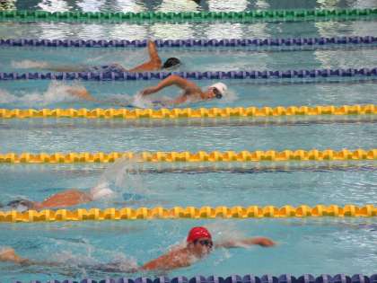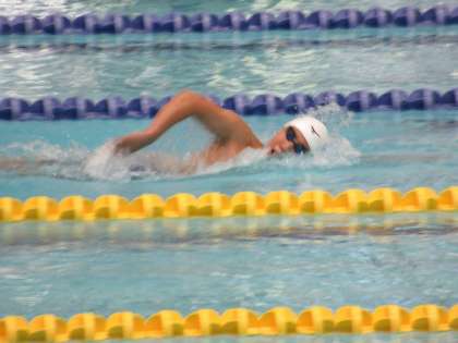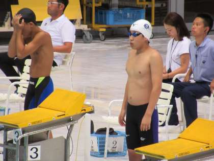 本日2日目、男子400m自由形に出場の2年生S・Yさんは、予選2組に登場です。スタートから上位集団が形成される中、50mのターンで、一気にスピードを上げるSさん、トップに躍り出ます。その後も徐々に2位との差をあけていき、300mでは体ひとつ分の差を付けます。ラスト50mで追い上げられますが、ここをねばり、見事、この組1位でフィニッシュ! 最終組の結果を待ちます。