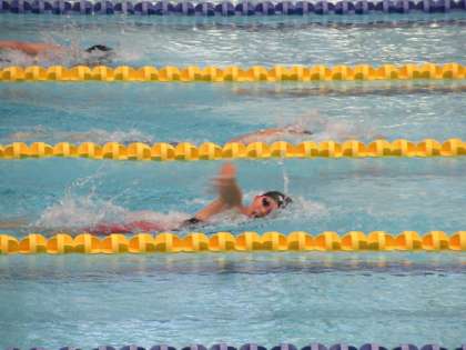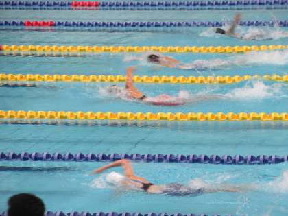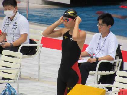 本日、女子400m自由形に出場のS・Kさんは、予選最終組に登場し、壮絶なトップ争いを展開しました。スタートから100mで上位3人の争いとなったこのレース、Sさんは3番手からギアを上げ200mで2位をキープします。その後、ラストスパートをかけますが、トップに一歩及ばず、全体2位で決勝へ進出します。