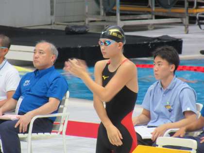 そんな盛り上がった雰囲気の中、午後一番のプログラム女子800m自由形決勝に3年生S・Kさんが登場してきました。水温27.5度のコンディションです。