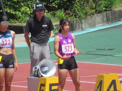 本日(8/7)、女子100mハードル予選の舞台に、3年生F・Nさんが登場してきました。昨年の和歌山大会に続く出場となりましたが、今年はホームグラウンドである西京極で、近畿の強豪を迎え撃つ迫力を感じます。