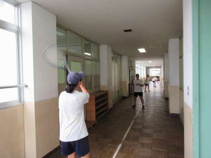 グラウンドが、昨日からの雨で使用できない状態のため、ソフトテニス部の皆さんも校舎内で工夫して練習していましたね。