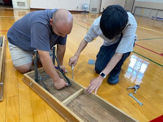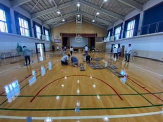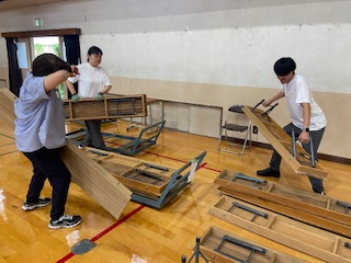 取材班が会議の合間に体育館をのぞくと、どうやら長椅子の確認をしているようです。2学期で長椅子をたくさん使う行事といえば…。
