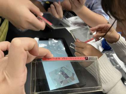 光の性質を利用して、「オリジナルステンドグラス作り」に挑戦です。「どうしたらきれいに輝くか?」協力して取り組んでいます。
