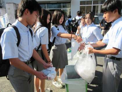 生徒の皆さんが持ってきてくれる回収物は、ご家族や地域の方のご協力もあってのものです。いつも直接、学校へ持ってきていただける地域の方もおられます。本当にありがとうございます。ここにも「九条はひとつ」があります。