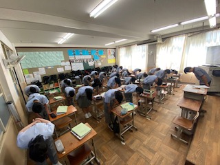 そこで、取材班が1年生の授業を見に行きました。授業前後の号令です。各クラス、3日目ということもあり、かなりできているではありませんか!