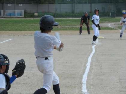 先頭バッターIさんがいきなりレフト前ヒットで出塁すると、2番Kさんはよく見てフォアボールを選びノーアウト1塁、2塁。次のバッターの間に塁を進め、ランナー2塁、3塁のチャンス。