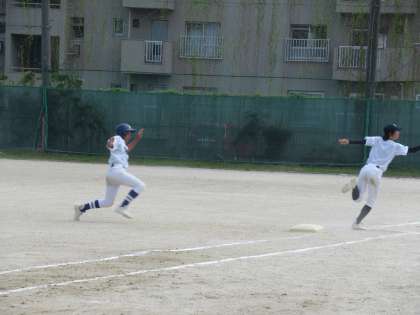 この回、後がなくなってきた相手チームが猛反撃に移ります。先頭バッターがファーストへの内野安打で出塁すると、続くバッターがライトへの強烈なライナーを放ちます。「うわ〜、やられたか...」と思ったその瞬間、ライトNさんがこれを見事にキャッチ!「よっしゃー、ナイスプレー!」またまた大歓声が起こります。