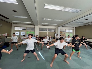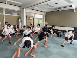 本番までの練習回数も限られています。体育館の舞台上での配置を確認しながら、何度も繰り返して練習しています。本当に暑い時間帯にもかかわらず、懸命に踊ってくれています。本当に楽しみです。