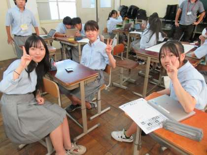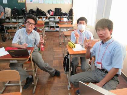 発表班、プレゼン作成班、掲示班、アイコン班に分かれて活動してくれています。だいぶ作業の方も進んだようで、ピースで応えてくれました。ありがとう!