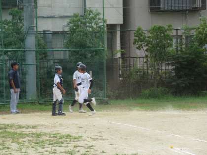 ここで相手の守備の乱れを突きます。打席は3番Kさん、ワイルドピッチでキャッチャーが球を後逸する間に、2塁ランナーIさんが一気にホームをつき、ついに先制!続けて3塁への送球がそれ、レフト線へボールが点々と転がる間にランナーKさんもホームイン!待望の得点、しかも2点をあげます。