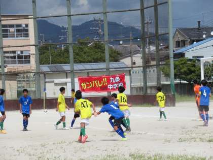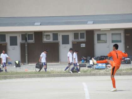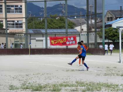 最初にチャンスをつかんだのは、相手チームです。パスをつながれ、九条中陣内深くに攻め込まれます。最後、左サイド角度のないところからですが、ゴールの枠をとらえたシュートを打たれます。しかし、これをキーパーYさんが見事に反応し、クロスバー上にはじき出します。ナイスキーパー!