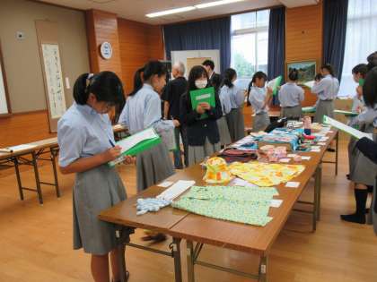 ふれあいサロンでは、地域の皆様も出展いただき、生徒の皆さんに作品の説明をしてくださっていました。手芸に絵画、書写など、どれも力作ぞろいです。すてき!
