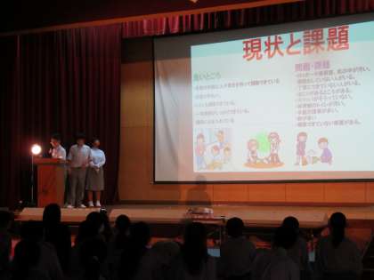 夏休み中に行われたリーダー研修会で決定した九条SDGs「12のゴール(目標)」について、それぞれの班が、現状・課題を明らかにし、達成目標を立て、そのための方法をプレゼンしてくれたのです。どの班も、しっかり取り組めていたことがわかります。