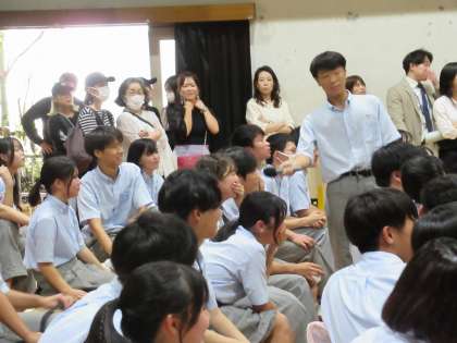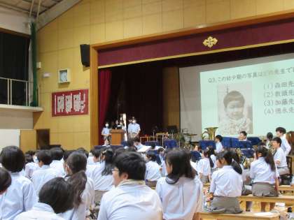 九条中学校の文化祭では、舞台の幕間も盛り上がります。しかも終盤です。生徒会本部の先生クイズに盛り上がる皆さん、「え〜」や「うわ〜」と、驚きや爆笑の連続でした。