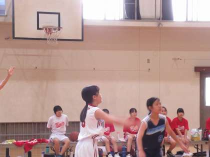 そして、第2クオーター開始早々に、右サイドからスピードのあるドリブルで切り込むTさんに、相手選手が思わずファウル!フリースローを得ます。このチャンスにシューターTさんは、見事、リングをとらえ1本目を決めます。よっしゃー!