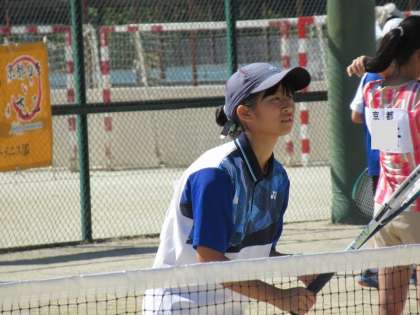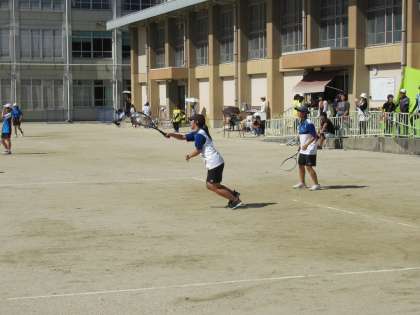 試合の方は、R南中ペアを相手に、常に先行される苦しい展開となりました。第1ゲームに続き第2ゲームもデュースに持ち込んだものの落とし、後がなくなります。第3ゲームは、本来の動きで、見事に取り、第4ゲームへ。ここでも途中「よう返した!」と、監督のコールが出る場面もありましたが、デュースの末、あと一歩及ばず敗退となりました。