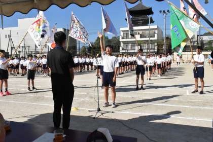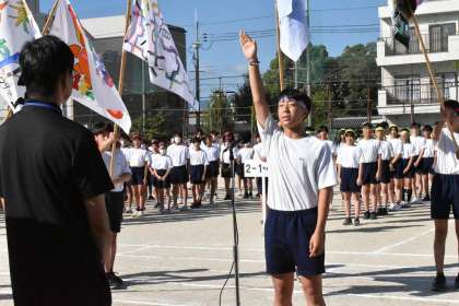 各クラスの学級旗に囲まれ、体育委員長Sさんが心を込めて宣誓を行ってくれました。ぐっときたねぇ。素晴らしかった!