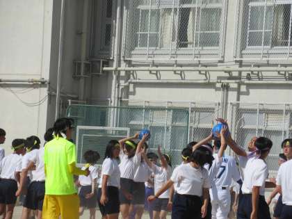 まずはたてわり班対抗のタイムレースです。A〜Lまでの12班が、タイムを競います。1年生、2年生、3年生がチームを組んで、一つのボールを後方へ送っていく様子は、学年を越えたつながりを実感します。「九条はひとつ!」です。