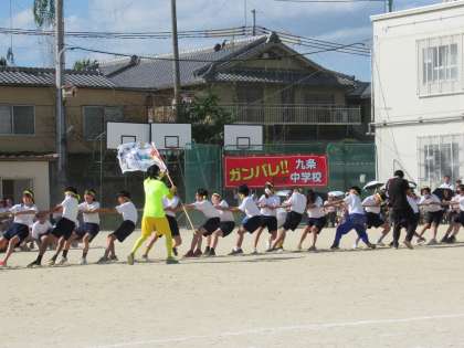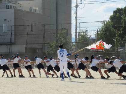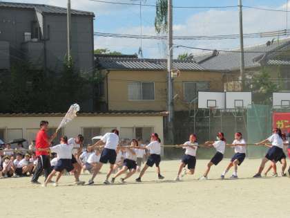 心をひとつに、力を合わせて綱を引く1年生。担任の先生も必死の声援です。どのクラスもいい感じだ。よく頑張りました!