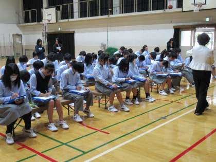 講師の先生からの問いかけにも反応よく、メモもしっかり取り、とにかく楽しい雰囲気で、礼儀やマナーに磨きをかける2年生の皆さんでした。この調子で、チャレンジ体験も頑張ってくださいね。