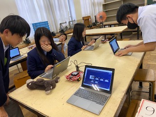 技術室では、3年生の授業で「プログラミング」を活用した授業に取り組んでいるという情報を現場リポーターは掴みました。GIGA端末を用いて、プログラミングのソフトとモーターと連動させています。走行している様子を、ビデオで撮影していますね。