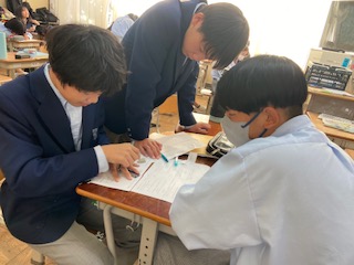 1年生の数学科では「変化と対応」という単元の授業をしています。現場リポーターが担当している授業なのですが、本日の授業はこの単元の総まとめである「特訓プリント」として集中して取り組んでいます。比例、反比例の関係を表・式・グラフと関連付けて問題を解いています。
