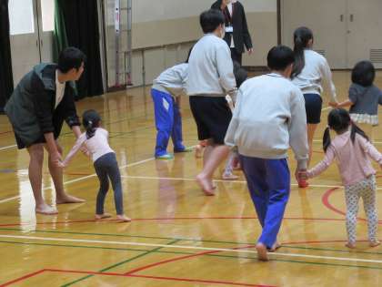 どちらかというと、3年生の方が戸惑いがちでしたが、ふれあい遊びが始まると、一気に打ち解けます。みんな楽しそう!