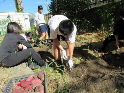 本日も、4・5組菜園では、サツマイモの収穫を行ってくれました。今日はみんなで、ぽかぽかおひさまに照らされ、なんと2時間がかりで作業してくれました。