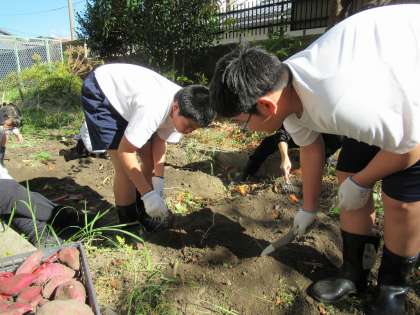 今日も出るは出るは立派なサツマイモが!これまでの最大級の物も出て感動です。土の中から、傷つけないように、大切に掘り起こす4・5組の皆さんの姿にも感動しました。ご苦労様です!